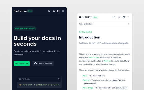 Ready to use templates powered by our premium Vue components and Nuxt Content. The templates are responsive, accessible and easy to customize so you can get started in no time.